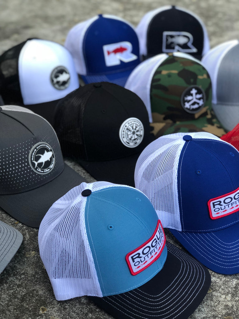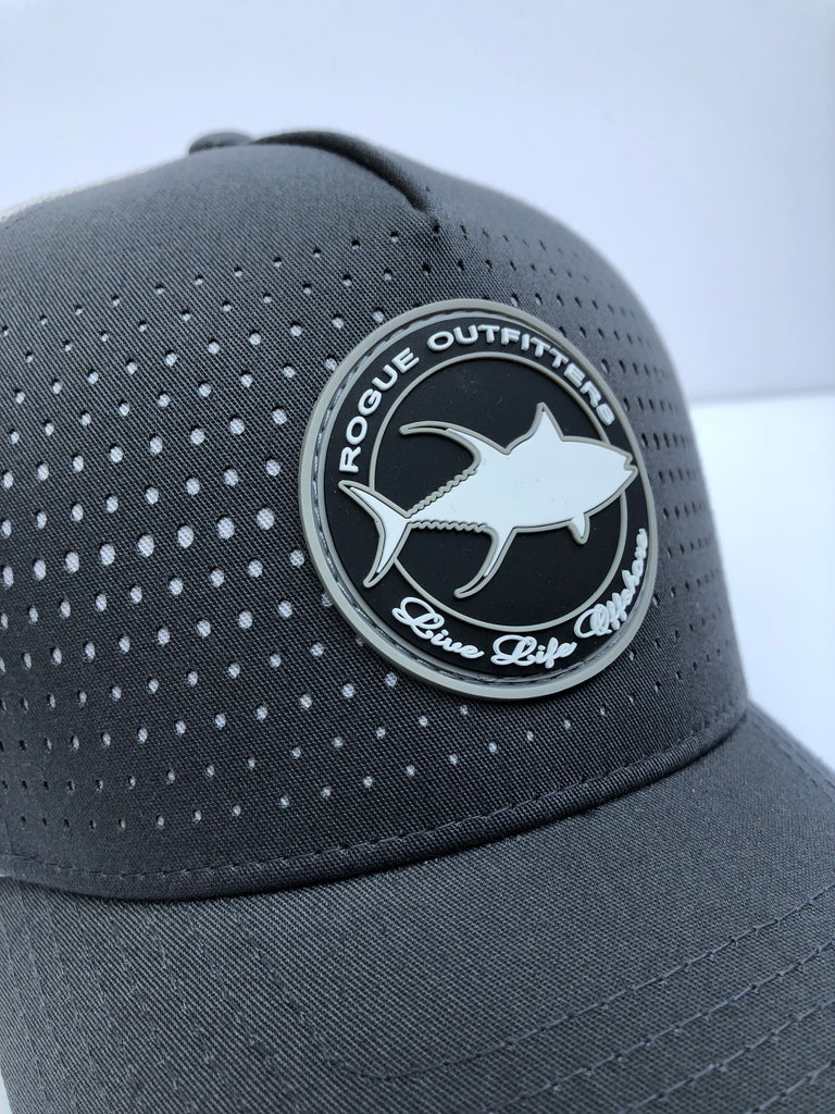 Show your fishing style with the original Rogue Outfitters Tuna patch Trucker Hat that is made by Richardson Hats which are built to last. The charcoal hat features the a large rubber Rogue Tuna patch with the words "Live Life Offshore" and white mesh for ventilation. Our trucker hats have a lightweight structured medium profile, with an adjustable snap back. One size fits most. Order your new favorite hat today!