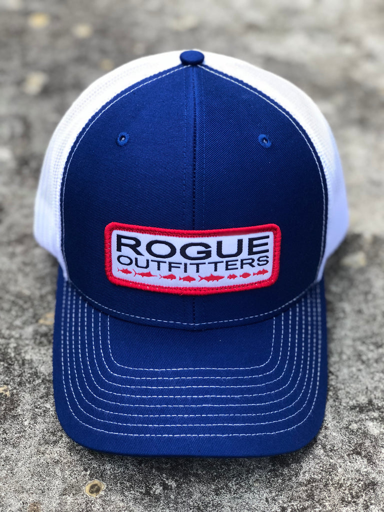 Show your American pride with the original Rogue Outfitters Offshore-to-Inshore Trucker Hat that is made by Richardson Hats which are built to last. The royal blue hat features the red, white, and blue Rogue Outfitters fishing patch and white mesh for ventilation. Our trucker hats have a lightweight structured medium profile, with an adjustable snap back. One size fits most. Order your new favorite hat today!
