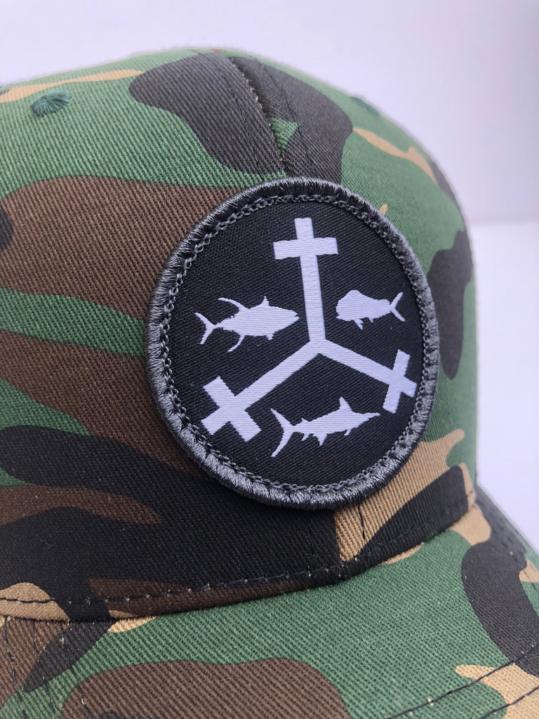 Show your fishing style with the original Rogue Outfitters Offshore Trifecta Trucker Hat that is made by Richardson Hats which are built to last. The Camo and White hat features the a large patch featuring our signature offshore trifecta of a Marlin, Tuna, Mahi and black mesh for ventilation. Our trucker hats have a lightweight structured medium profile, with an adjustable snap back. One size fits most. Order your new favorite hat today!